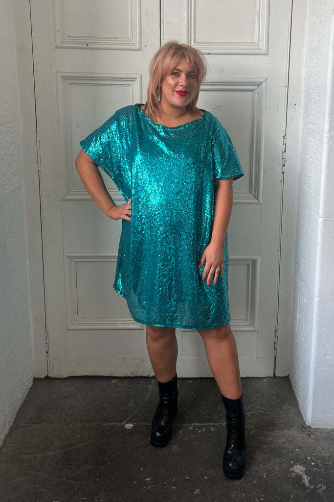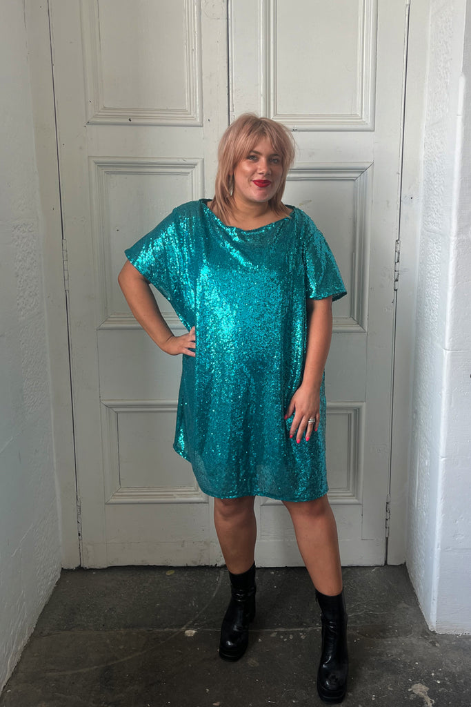 We have used the last of our glorious turquoise sequin to make a one off size XL Sequin Mini T-shirt dress.