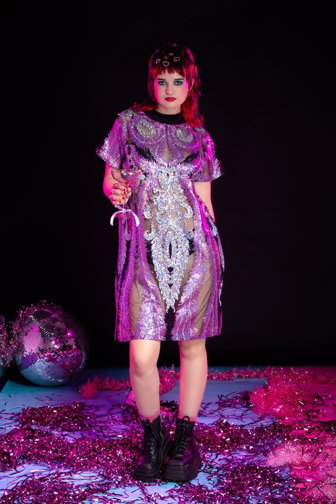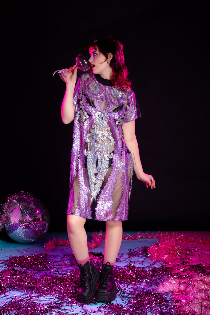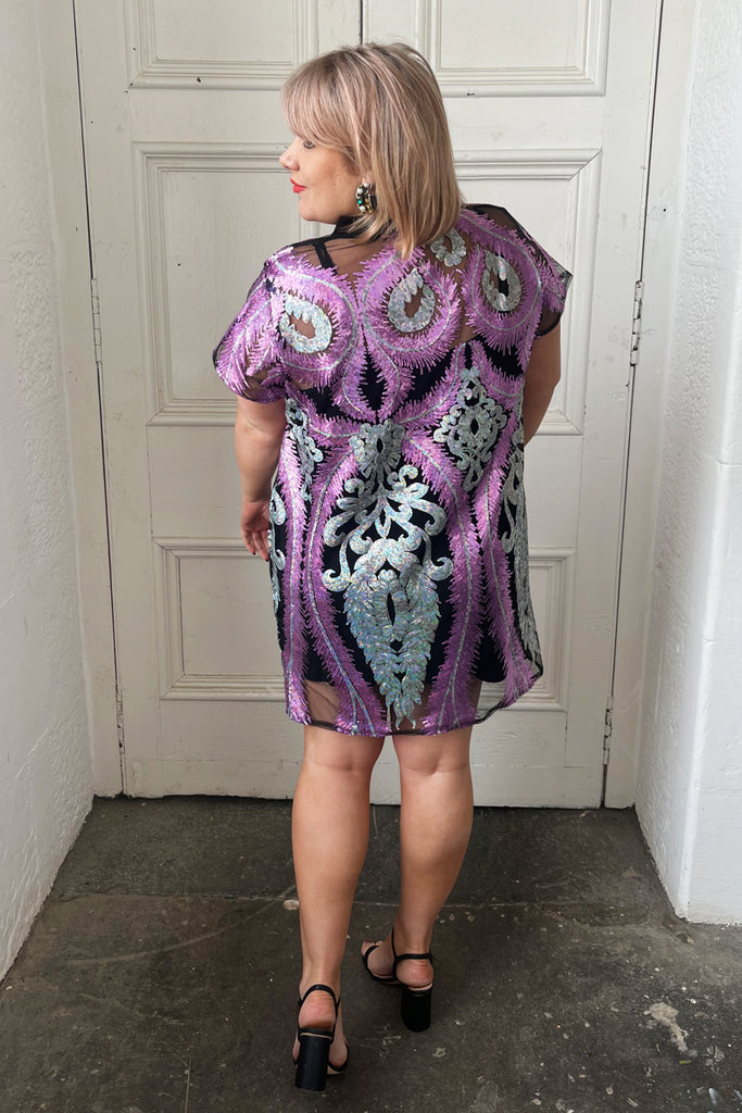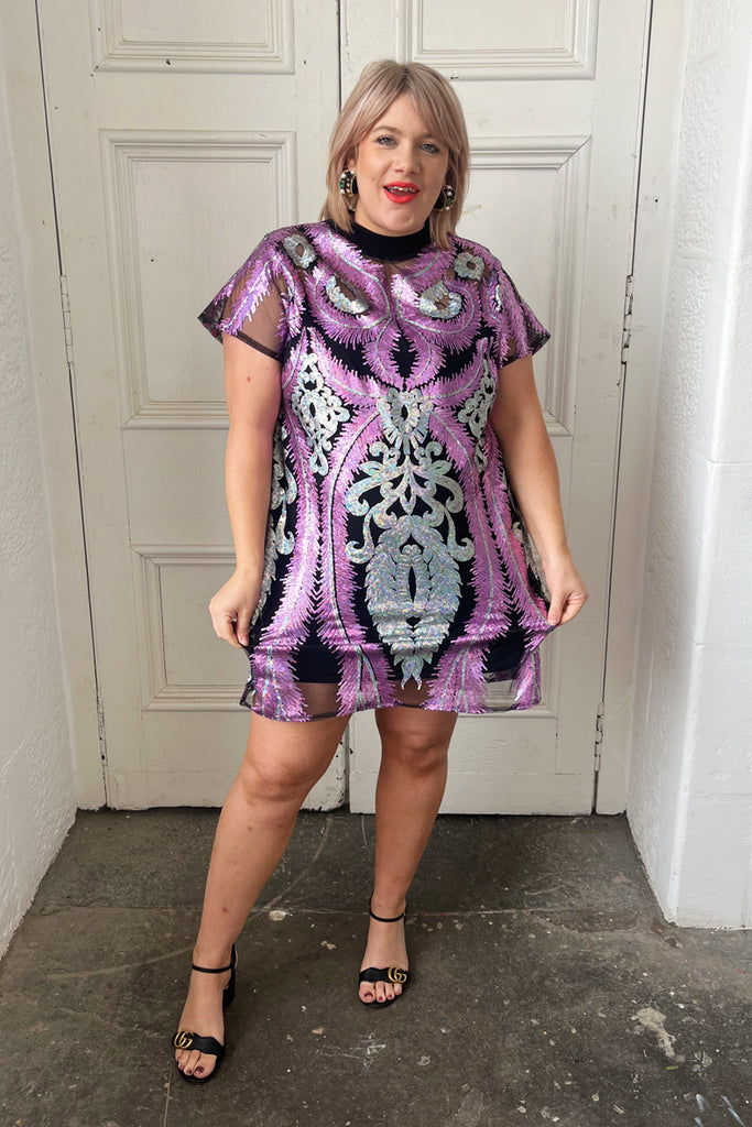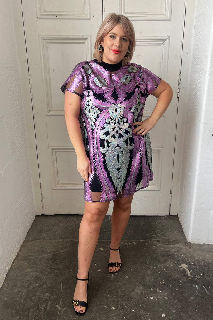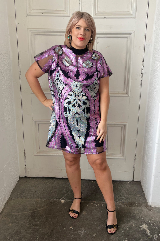 Our Zelda sequin mini dress is giving great Gatsby glamour! In our signature mini dress silhouette with a relaxed fit and jersey rib neckline. The sequin fabric is a black mesh base with an all over sequin motif in iridescent and purple tones.
