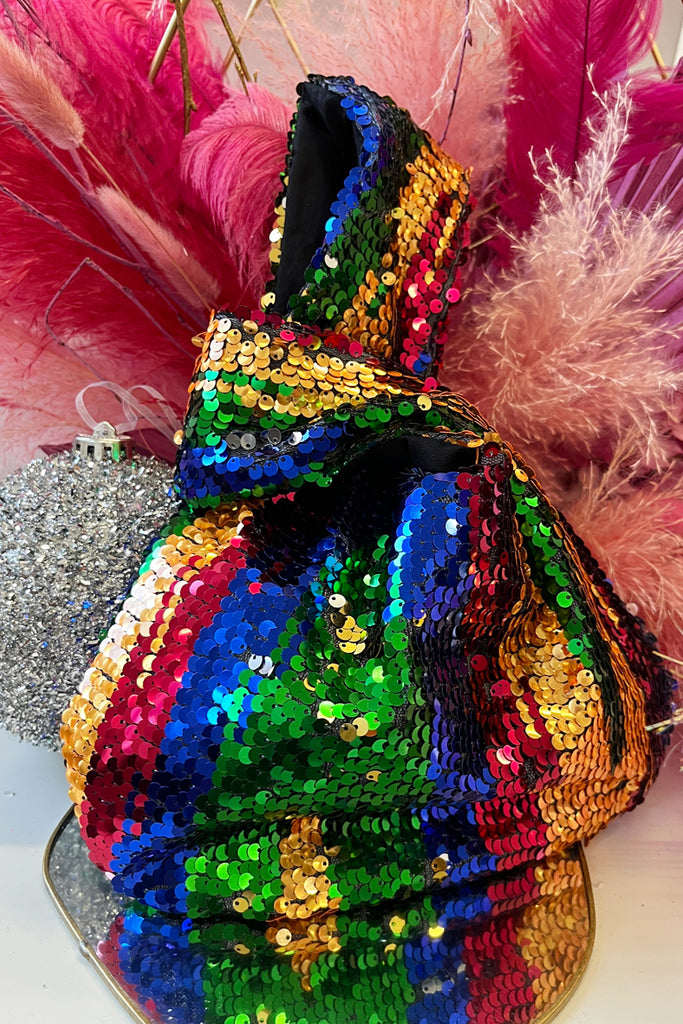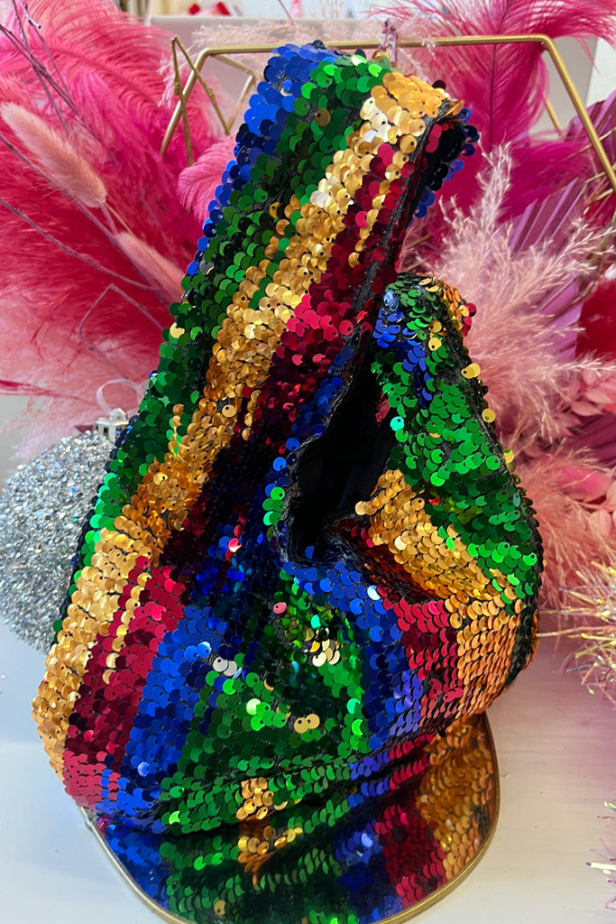 We are obsessed with the sequin knot bags. The perfect little bag to for your Christmas nights out. Created from waste fabrics we have developed these in a range of different colours. This listing is for our Rainbow Bowie based sequin fabric.