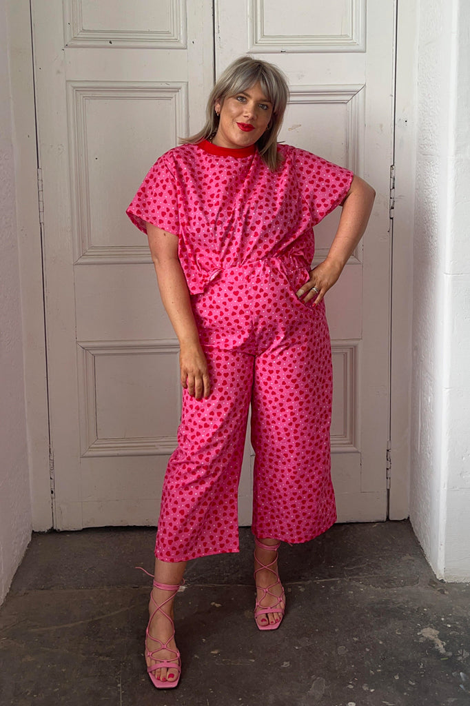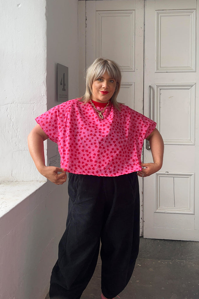 Lover is here! The softest cotton heart print fabric in our signature boxy crop fit. Finished with a red jersey rib neckline.