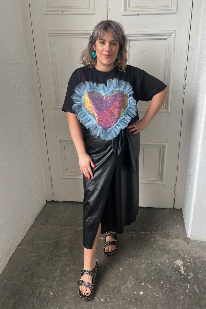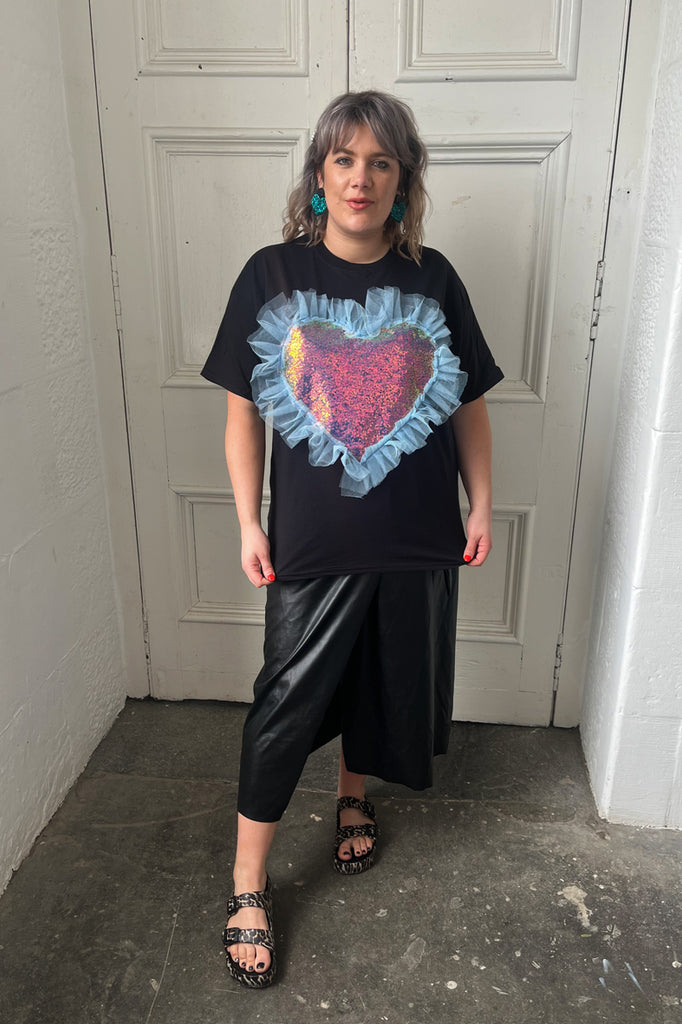 Black organic cotton t-shirts with a large scale heart motif created from our deadstock moonlight sequin fabric finished with a black tulle ruffle hem.