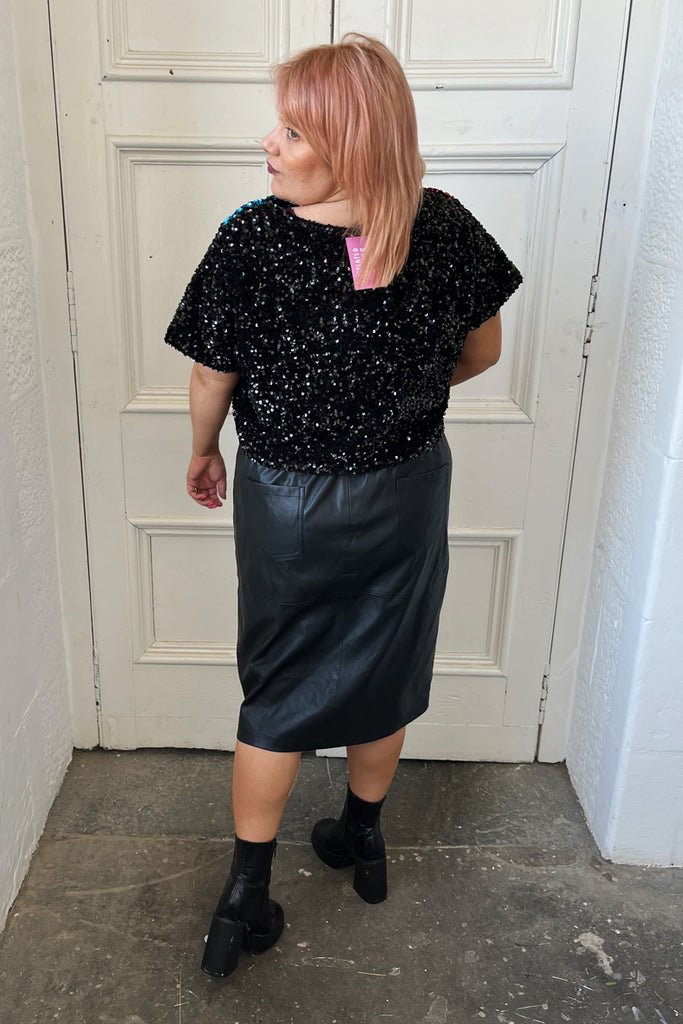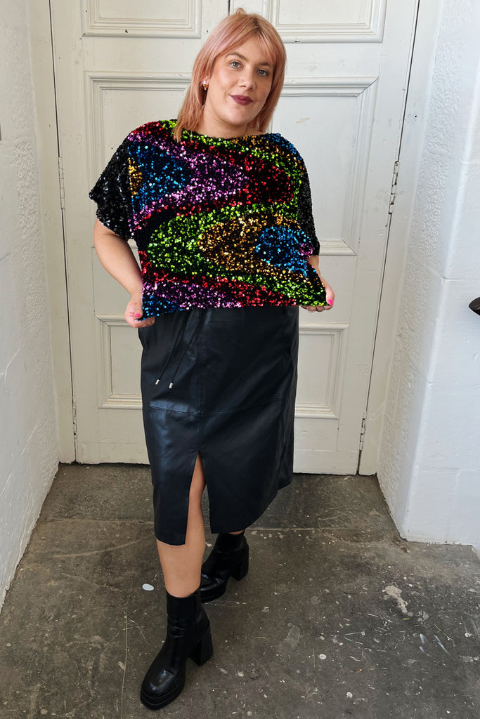 We adore the carnival fabric and this crop top has used the very last section of our rainbow carnival sequins with a wide neck cut, our normal crop length and we have used midnight black panels for the back and sleeves.