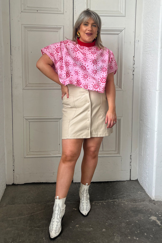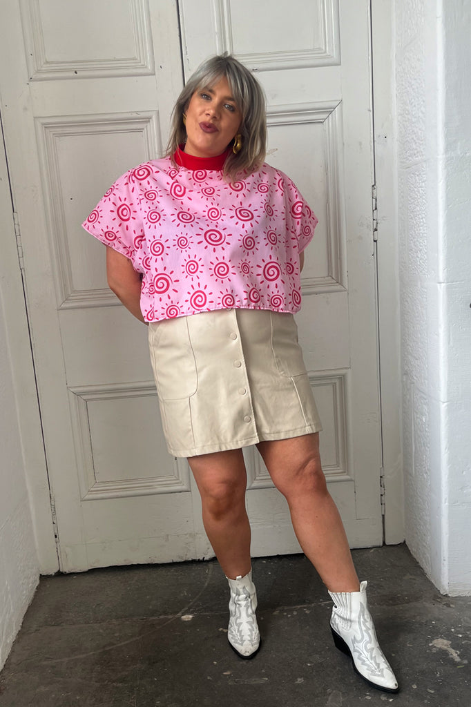 Boxy crops are THE top of summer cut to a perfect slightly oversized fit and a great length for tucking into high waisted jeans or wear over a slip dress or mini skirt. The strawberry sunset boxy crop is created from the softest cotton in strawberry tones with pink sunset swirls. Created from breathable cotton in a relaxed fit for all of our comfort queens!