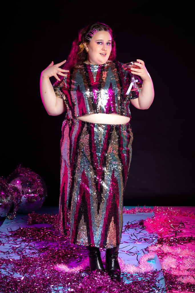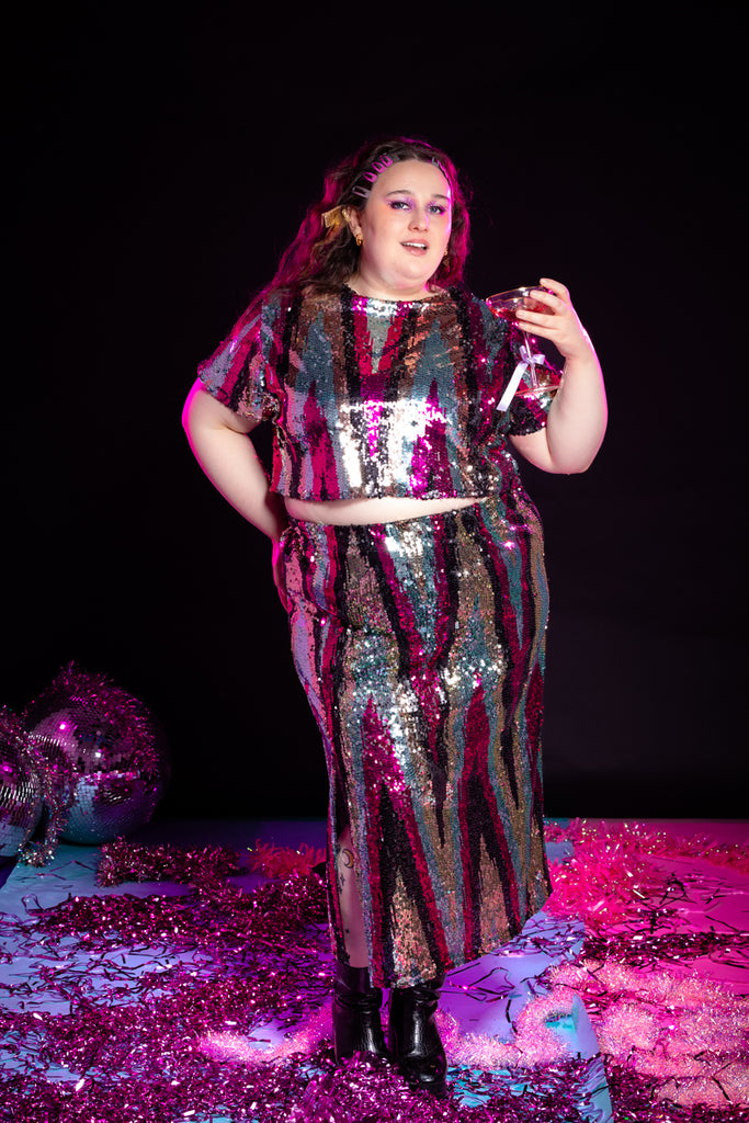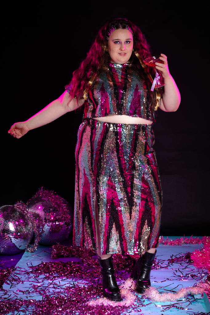 Our Midi skirt is the skirt of the season! We have launched it in the bright magenta pink and silver Ziggy sequin for ultimate party gal vibes!
