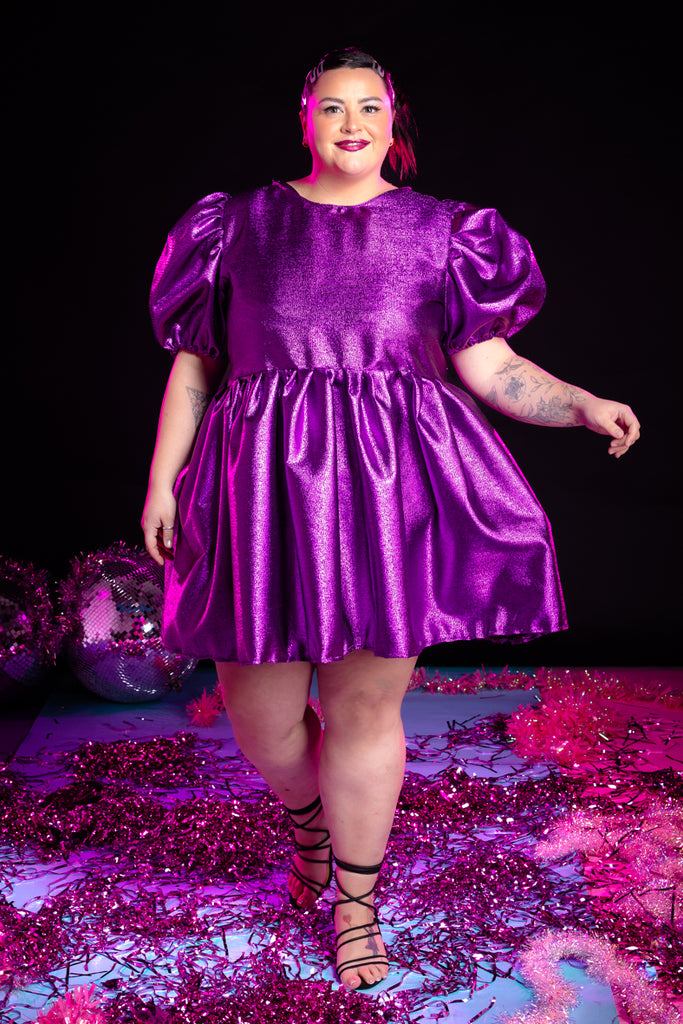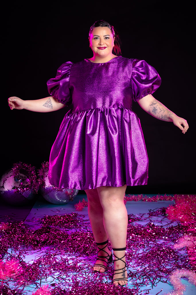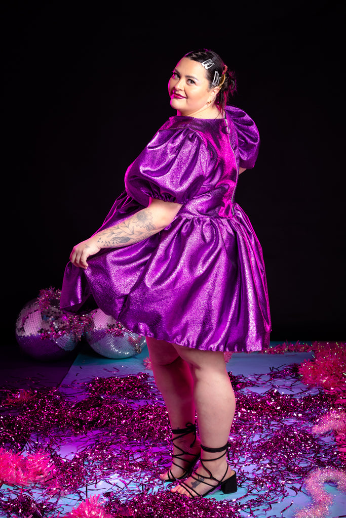We are obsessed with this brand new silhouette. The Valentina dress is created from our  purple metallic fabric with supersized puff sleeves, a smock fit bodice and full skirt. Finished with a chunky metal tooth zip up the centre back.